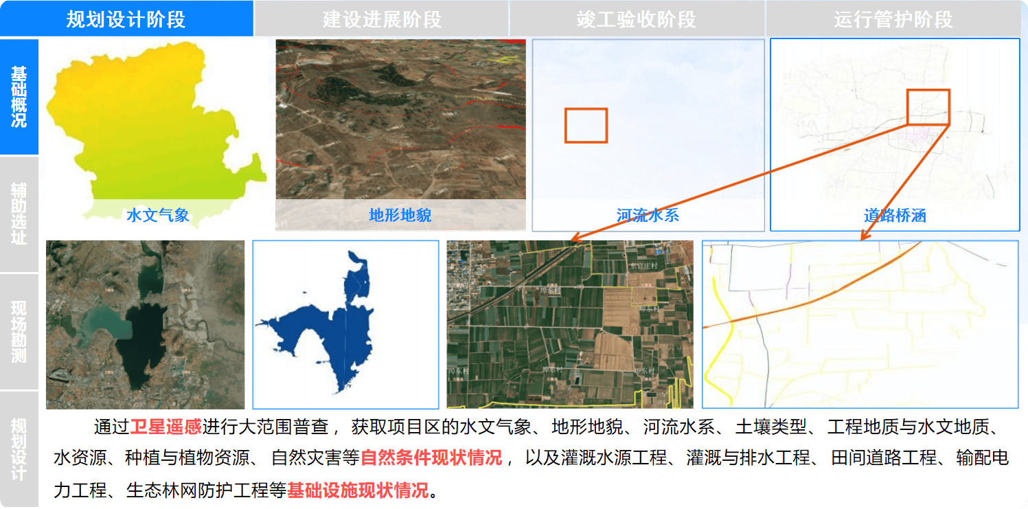 3。 完工验收是项目扶植的环节环节。遥感监测手艺可以或许对完工项目进行全面、详尽的查抄,确保工程质量合适尺度。通过高分辩率卫星影像和无人机航拍,对农田根本设备的扶植环境进行全方位核查,发觉问题及时整改,确保项目高质量交付。
