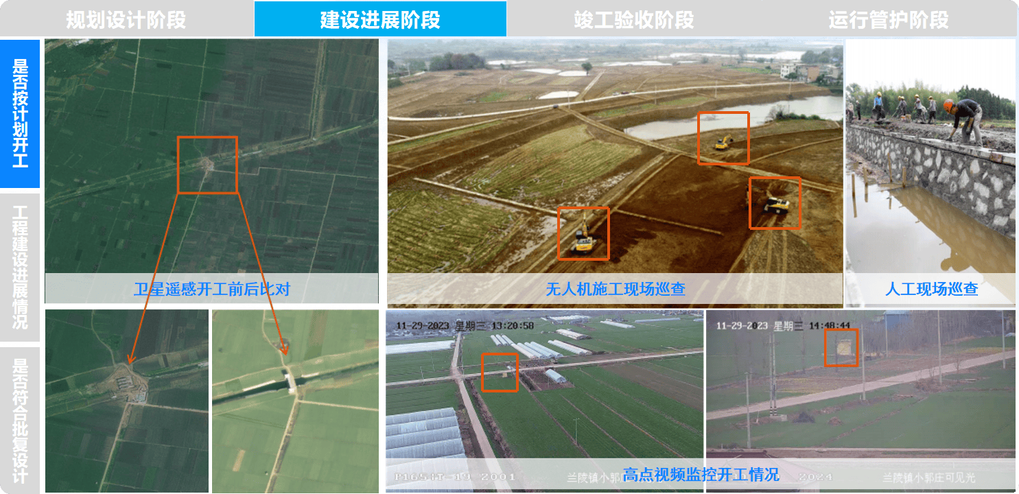 2。 施工扶植阶段,遥感监测手艺阐扬着“监视员”的感化。从“设备角度”,细致展示每个项目农田根本设备的及扶植进度。通过高点视频,能够及时查看单个农田根本设备的扶植进展环境。正在此根本上,联动无人机,按照农田根本设备的分布,进行无人机航路规划,进行空中视角的扶植进度详查,实现地-空监测体例的联动,确保施工质量取进度双达标。