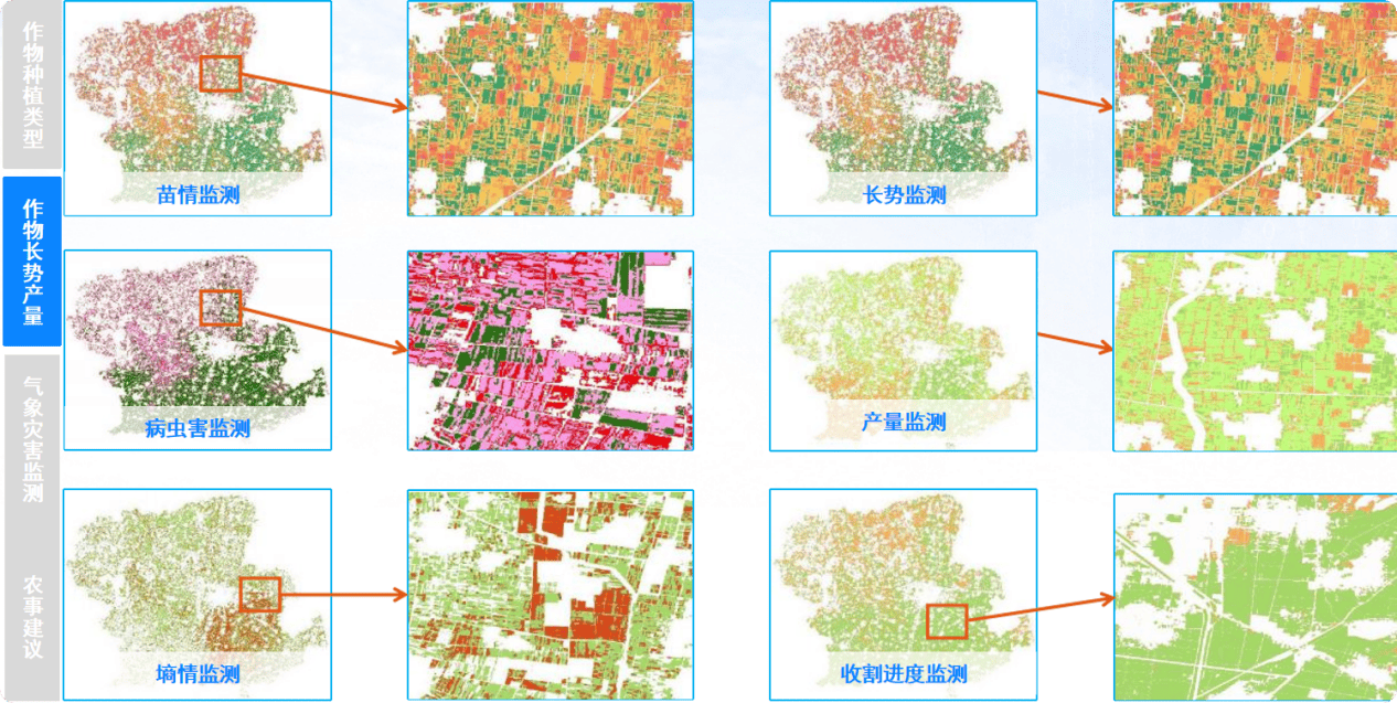 2。 做物长势产量借帮遥感监测手艺,通过对植被指数、土壤湿度等目标的阐发,及时发觉做物发展过程中的问题,如病虫害、缺水、缺肥等,为精准施肥、灌溉和病虫害防治供给决策支撑,